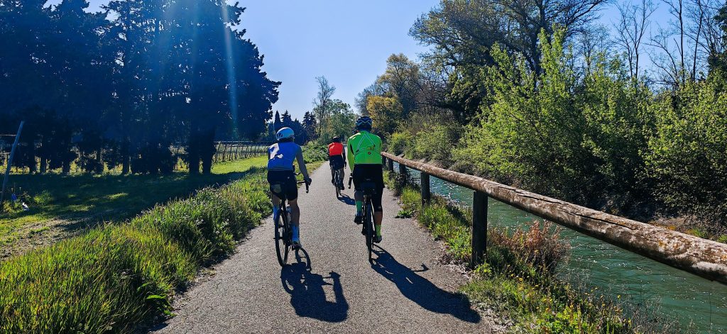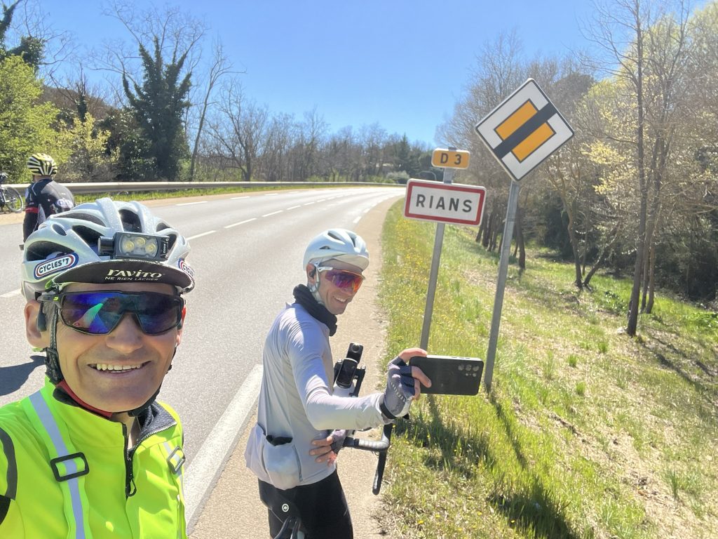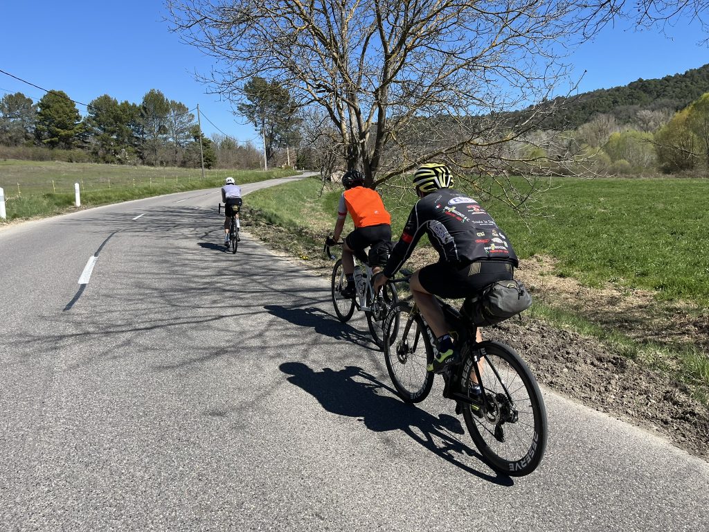7h00. Le groupe s’élance depuis Mollans-sur-Ouvèze sous un ciel dégagé. La trace que j’ai conçue offre un premier tiers roulant, presque généreux, qui longe le Luberon et suit la Durance. On savoure. On discute. On installe le rythme. C’est ça aussi, la Flèche — ces premiers kilomètres où tout semble encore possible et où l’on prend soin de ne pas brûler les cartouches trop tôt.