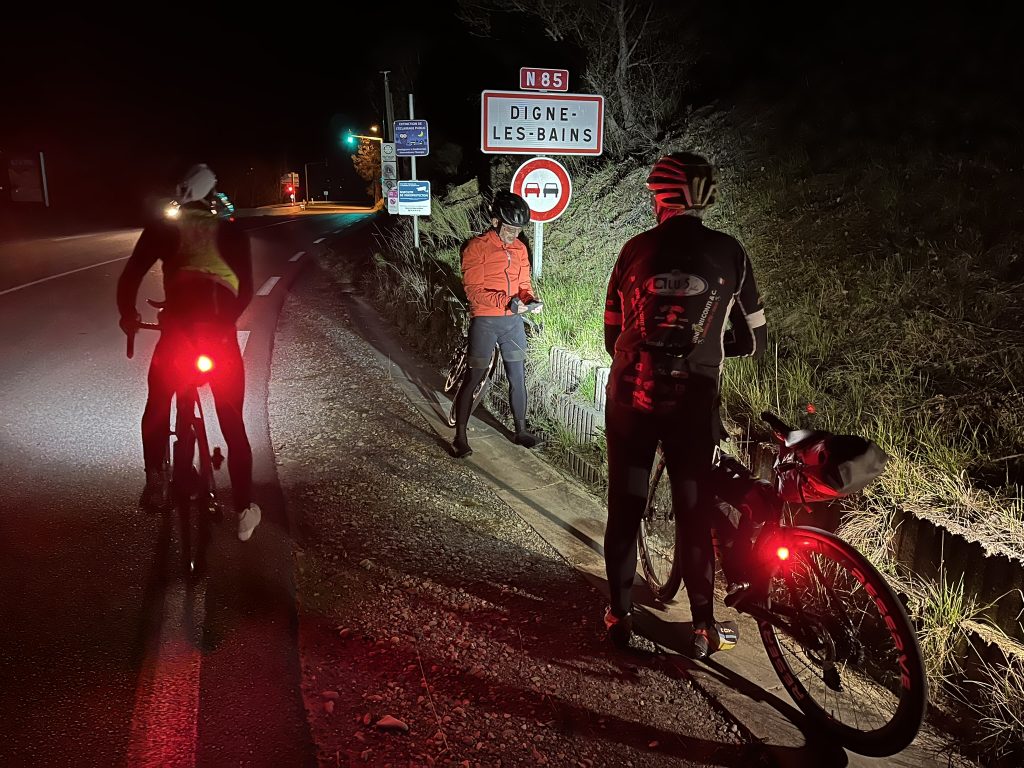 Après Digne, la nuit s’installe vraiment et avec elle, un froid que personne n’avait pleinement anticipé. Les températures dégringolent. 10 degrés. Puis 5. Puis en dessous de zéro. Les doigts s’ankylosent, la respiration se fait plus courte, les épaules remontent toutes seules. On pédale mais on commence à grelotter sérieusement.