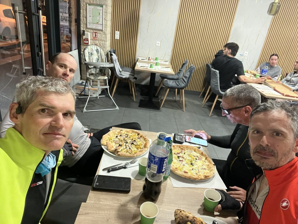 Nous arrivons à Digne-les-Bains à 21h30. Près de 300 km au compteur. La nuit est tombée, les températures ont commencé à chuter et il y a consensus unanime : une pause s’impose. Autour d’une table et de pizzas bien méritées, on refait le plein de tout — calories, chaleur, moral. Ces moments-là font partie intégrante de la Flèche. On parle, on rit, on repousse un peu l’idée des heures qui viennent.